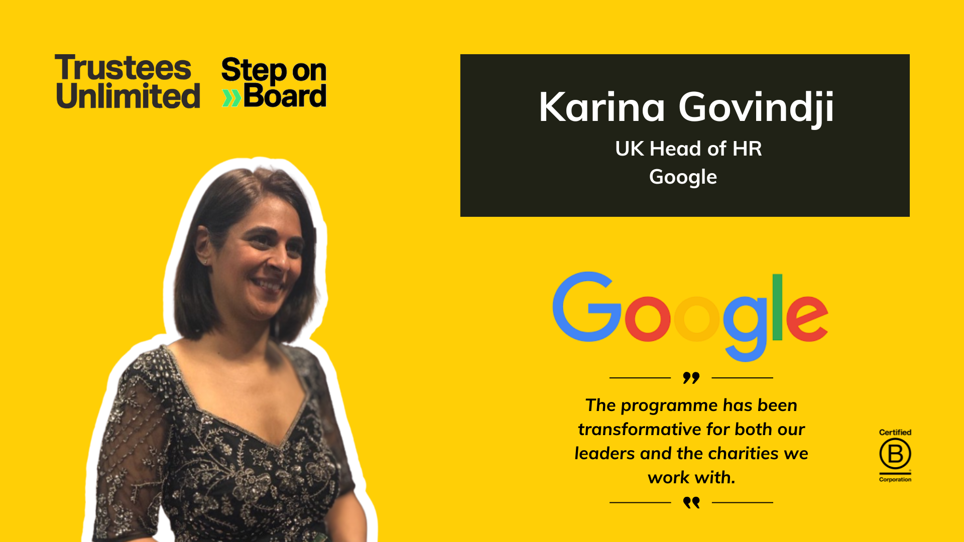 That’s how Karina Govindji, Head of HR at Google, reflects on their partnership with Step on Board, the trustee placement programme run by Trustees Unlimited. Since 2016, Step on Board has been helping organisations like Google create meaningful engagement between senior leaders and charity boards, delivering lasting impact for both parties.